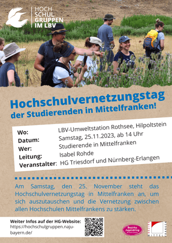 Studierst du in Mittelfranken und bist neugierig darauf, welche faszinierenden Möglichkeiten die Naturschutzarbeit der LBV-Hochschulgruppen des Regierungsbezirks bieten? Dann laden wir dich herzlich ein, gemeinsam mit den engagierten LBV-Hochschulgruppen aus Triesdorf und Erlangen-Nürnberg den Hochschulvernetzungstag der Studierenden in Mittelfranken zu erleben. Am Samstag, den 25. November, erwartet dich ein ereignisreicher Tag an der LBV-Umweltstation am Rothsee.