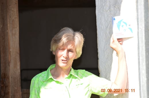 Frau Lösl aus Bertelsdorf bei Stein bei der Übergabe der Plakette „Schwalbenfreundliches Haus". Frau Lösl bewahrt die Gebäude des stillgelegten Bauernhofes ihres Vaters und „betreut“ rund 10 Rauchschwalbennester. Außerdem hat sie an ihrer Scheune erfolgreich einen Turmfalkenhorst angebracht und sie möchte diese auch noch für Schleiereulen attraktiv machen.
