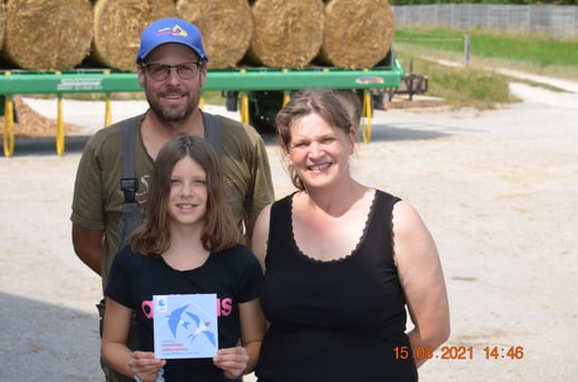 Familie Meyer aus Steinbach bei Cadolzburg bei der Übergabe der Plakette „Schwalbenfreundliches Haus". Die Familie betreibt dort einen Aussiedlerhof und an und in ihm befinden sich 20 Mehlschwalben- und 13 Rauchschwalbennester die 2021 eifrig die frühsommerliche Mückenplage bekämpften.