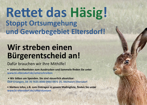 Wir möchten Sie auf die Bürgerinitiative aufmerksam machen, die sich für die Natur einsetzt, die durch die geplante Ortsumgehung mit Anschluss für ein Gewerbegebiet in Eltersdorf bedroht ist.