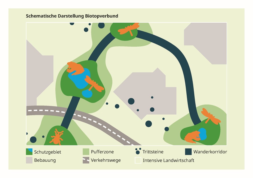 Intakt verbundene Feuchtgebiete, Grünflächen, Tümpel, Weiher, Wälder und andere Lebensräume speichern mehr Kohlenstoff in Boden und Pflanzen, zudem sorgen die Pflanzen für einen kühlenden Effekt. Auch die Wasserzyklen sind stabiler und halten mehr Wasser in der Fläche.