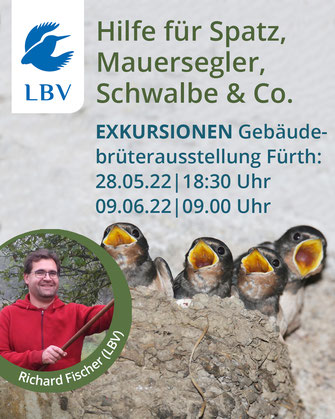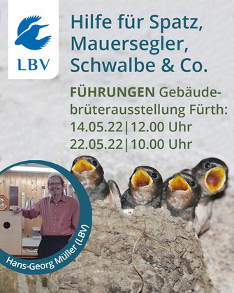 Vom 11. bis 26.05.2022 kann die Gebäudebrüterausstellung im Quartiersbüro, Spiegelfabrik, Lange Straße 53, in Fürth besichtigt werden. Die Öffnungszeiten sind variabel. Bitte informieren Sie sich über unsere Webseite: fuerth.lbv.de Der Eintritt ist kostenlos. Die Eröffnung ist am 11.5.22 um 19.00 Uhr.