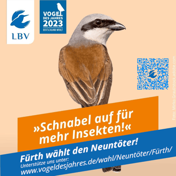 Unterstützt uns deshalb bitte und wählt mit uns den Neuntöter zum Vogel des Jahres 2023 unter https://www.vogeldesjahres.de/wahl/Neuntöter/Fürth/