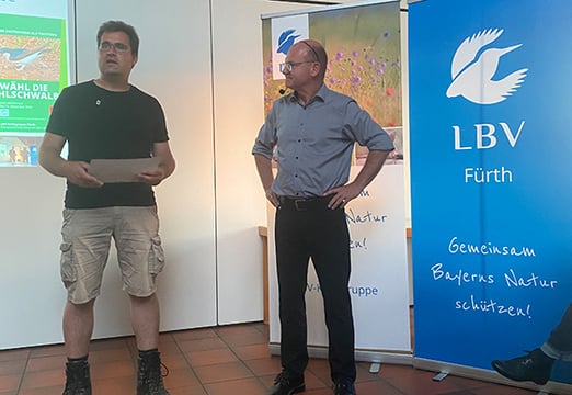 Richard Fischer, Kreisgruppenvorsitzender des LBV Fürth, schilderte die schwierige Situation der Gebäudebrütenden Vogelarten, die mit teils drastischen Bestandseinbrüchen zu kämpfen haben. Um die Bevölkerung für die schwierige Situation der Gebäudebrüter zu sensibilisieren und Schutzmöglichkeiten aufzuzeigen, zeigt der Landesbund für Vogelschutz eine Ausstellung zum Thema. Der Arbeitskreis Gebäudebrüter der Kreisgruppe Fürth führt seit einigen Jahren ein Monitoring von Niststätten dieser Vogelarten durch und engagiert sich mit Bau und Anbringen diverser künstlicher Nisthilfen.