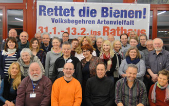 31.01.2019 - Mit viel Prominenz und langen Schlangen vor den Eintragungstischen startete heute die Eintragungsfrist für das Volksbegehren Artenschutz im Nürnberger Rathaus. Bereits vor 9 Uhr fanden sich viele prominente Unterstützer ein, um sich als Erste einzutragen: Als Biene verkleidet brachte Oliver Tissot sogar einen Bienenstich mit. Gisela Volz und Dr. Jürgen Bergmann von Mission Eine Welt wie auch Pfarrer Bielmeier stehen für die Unterstützung aus den Kirchen, der Umweltreferent Dr. Peter Pluschke für Unterstützung aus der Verwaltung. Im Stadtrat geht die Unterstützung quer durch die Parteien. Und der Oberbürgermeister Dr.Uli Maly? Er hatte sich schon lange als Unterstützer einer ökologisch(er)en Landwirtschaft geoutet und unterschrieb natürlich auch. Aber zuvor musste er sich, wie alle, in die lange Schlange vor den Eintragungstischen einreihen, Möglichkeit für viele Mitunterzeichner, ihren OB direkt anzusprechen.